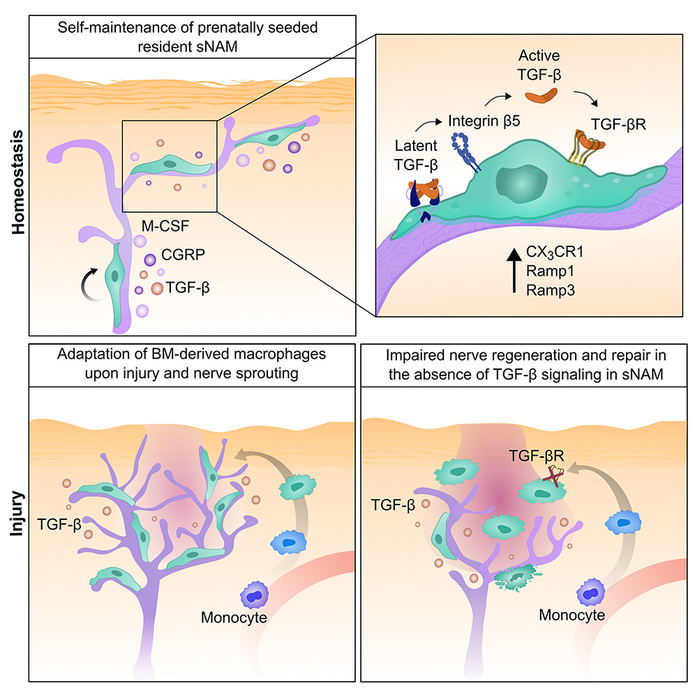Resident macrophages play integral roles in maintaining tissue homeostasis and function. In the skin, prenatally seeded, specialized macrophages patrol sensory nerves and contribute to their regeneration after injury. However, mechanisms underlying the long-lasting postnatal commitment of these nerve-associated macrophages remain largely elusive. Here, we found that traumatic injury induced recruitment of myeloid progenitor cells to the sprouting axons of sensory nerves, where they gradually acquired a nerve-associated macrophage-like profile. This identity change was driven and maintained by the immediate microenvironment, particularly by transforming growth factor-β (TGF-β), which was locally activated by the physical interaction with nerves and integrin-mediated cleavage, and by the neuropeptide calcitonin gene-related peptide (CGRP). Moreover, TGF-β-mediated macrophage specification was essential for proper nerve regeneration following injury. Overall, we identify TGF-β as a conserved, spatially regulated mediator governing local imprinting and long-term specialization of macrophages within the subtissular neuronal niche, offering insights into precise bidirectional neuro-immune crosstalk underlying skin homeostasis.